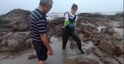 皮皮趁著大退潮趕海,碰見這條巨物太兇猛,老鄉都來幫忙擒住它