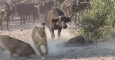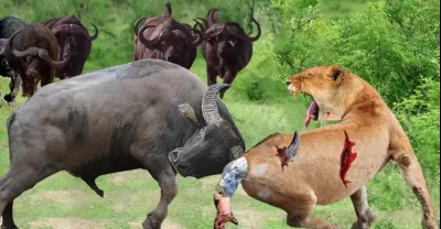 عالم الحيوان - الم! لا تستطيع أنثى الأسد حماية صغارها عندما تهاجمها جاموس غاضب مجنون