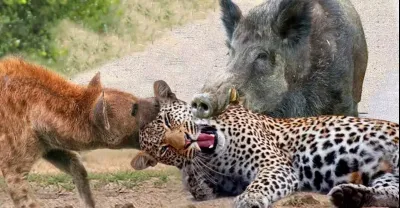 غريب ... الضباع يقضم رأس النمر لإنقاذ الخنزير - الخنزير مقابل النمر والضباع