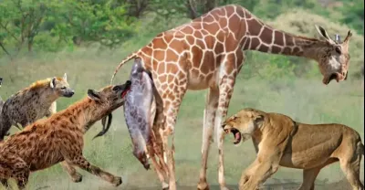 رهيبة ... أم زرافة شجاعة تهاجم الضباع والأسد لتنقذ حياة طفلها - الزرافة مقابل الأسد والضباع
