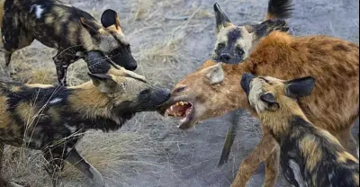 Painful Hyena Is Brutally Attacked By Wild Dogs To Steal Its Prey And The Profiteer Is Leopard