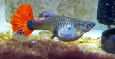 孔雀魚生下 64 條魚苗,而雄性孔雀魚追著她。