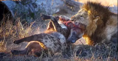 一頭雄獅能幹掉幾隻斑鬣狗?非洲獅子一口咬死鬣狗,不愧非洲霸主