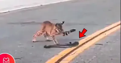 猞猁在路上攻擊蛇