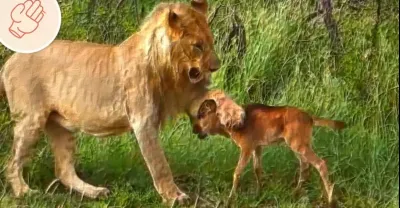 獅子救了小牛,防止小牛被另一頭獅子吃掉!動物救動物的瞬間