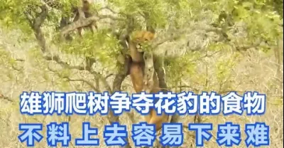 #獅子 爬樹爭奪花豹的獵物,不料上去容易下來難看,到最後太搞笑了