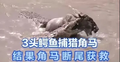 3頭鱷魚捕獵 #角馬,結果 #鱷魚 不小心咬斷角馬尾巴,讓角馬得以逃脫