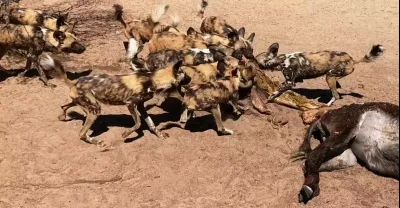 Rescued african wild dogs feeding in Botswana - Nourrissage de lycaons