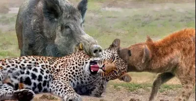 Weird... Hyenas Biting Leopard's Head To Rescue Warthog - Warthog Vs Leopard, Hyenas