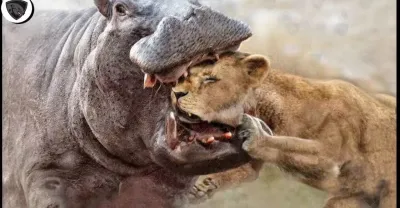 Angry Hippo Opened its Mouth Wide and Chewed on Lion Head