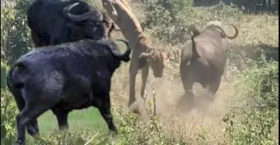 Herd Buffalo Fight Lion To Save Another Buffalo