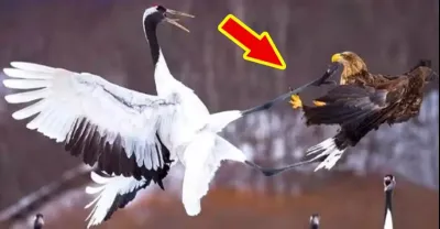 老鷹俯沖捕獵丹頂鶴,不料被丹頂鶴一記飛踢,老鷹直接被踢懵了!