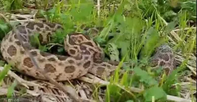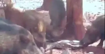 蟒蛇進入豬巢穴里吃蛇