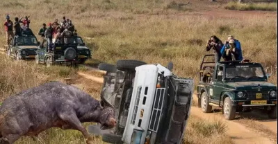 憤怒的水牛非常用力地攻擊汽車,野生動物攻擊