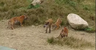 一隻野豬單挑三隻老虎,打的異常激烈,最後結局出乎意料