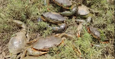 水草下冒出一堆鉗子,小妹眼疾手快,連抓好幾隻大螃蟹