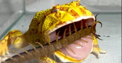 一隻吃豆子的青蛙對一隻大蜈蚣很生氣