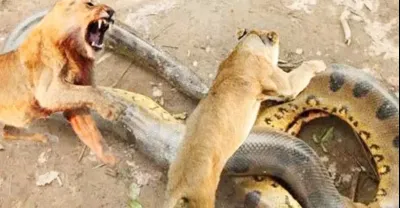 蟒蛇攻擊幼崽,母獅回擊蟒蛇