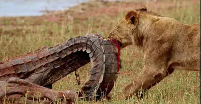 獅子獵殺鱷魚並吃掉它們,獅子與鱷魚戰鬥至死