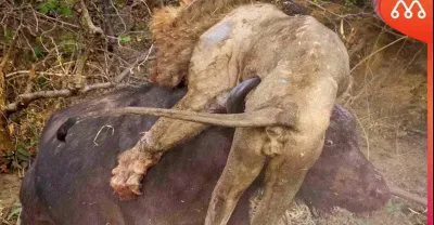 獵捕中水牛的角在獅子肋骨上