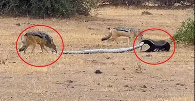 蜜獾大戰巨蟒的真實場景:胡狼趁機偷襲,蜜獾以一敵三兇殘至極!