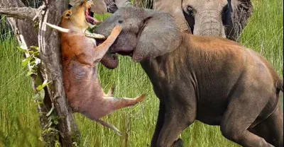 憤怒的大象非常用力地攻擊獅子,野生動物攻擊