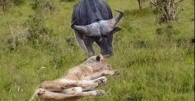 老獅子在救寶寶的憤怒水牛面前無能為力,野生動物的嚴酷生活