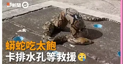 蟒蛇吃太飽鑽排水孔被肥肚卡住困路中 消防員花1hr救援