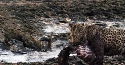 母花豹開啟生存新技能:40斤非洲大鲶魚,一口一條根本停不下來