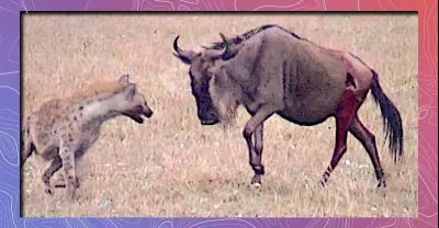 角馬為抵禦孤獨的鬣狗攻擊而掙扎形象的