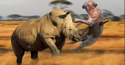 犀牛媽媽為了救她的孩子,非常殘忍地攻擊獅子
