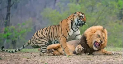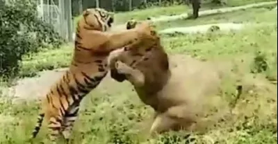 老虎伏擊,老虎直接向獅子張嘴就咬