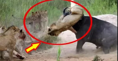 11隻獅子攻擊1頭野牛,聰明野牛一招自救,鏡頭記錄獅子嗷叫全過程!