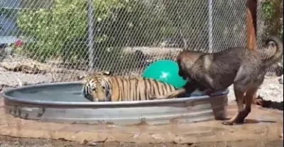 狗狗想要玩老虎的玩具,大老虎不讓 ,接下來的畫面憋住別笑