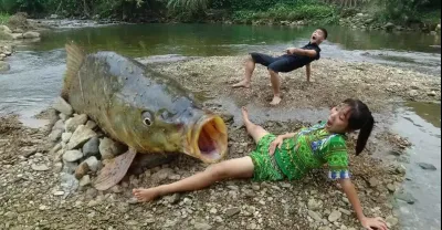 小情侶在海邊捕大魚,原始生存技能
