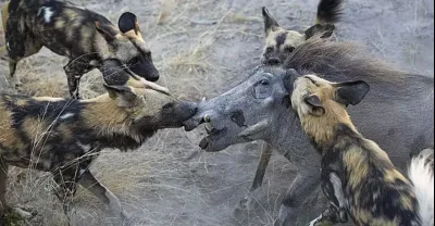 頂級野生狗攻擊疣豬,非洲野犬VS疣豬,真正的野生動物攻擊!