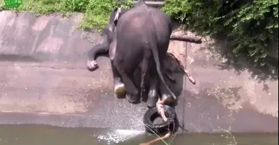 大象掉進河裡上不了岸,經過大夥和大象的努力不懈,大象終於返回樹林