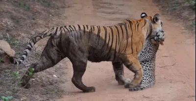 老虎獵殺花豹,獵殺完美動作行雲流水