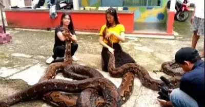 鏡頭拍下少女玩弄大蟒蛇全過程