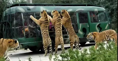 在野生動物園碰到老虎,坐在車裡真的安全嗎?老虎:你們真漂亮!