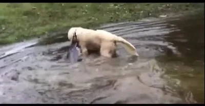 這狗狗厲害了,出其不意的就把鲶魚拖上岸