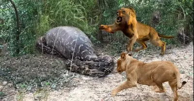 獅子王獵殺大蟒蛇,整個動作行一氣呵成