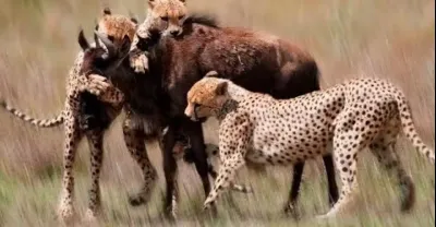 這是一頭有傲骨的角馬,遭三隻獵豹圍捕,上演大反擊