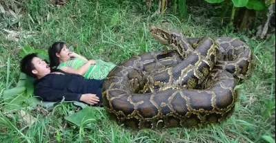 原始生活:小情侶用手抓住大蟒蛇