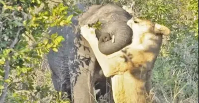 實拍 母獅攻擊大象 好像有點自不量力