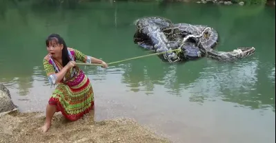 原始生活:聰明的女孩通過簡單的陷阱捕獲大蟒蛇