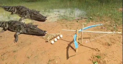 野外鱷魚發現了食物,沒想到一開餐就觸動了機關