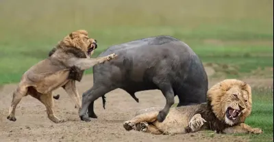 兩頭獅子圍捕牛哥,結果遭到牛哥大反擊