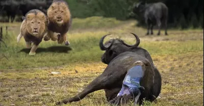 獅子對剛出生的小水牛 虎視眈眈 努力保護也難逃厄運