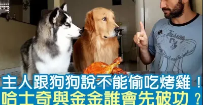 主人跟狗狗說不能偷吃烤雞!哈士奇與金金誰會先破功?